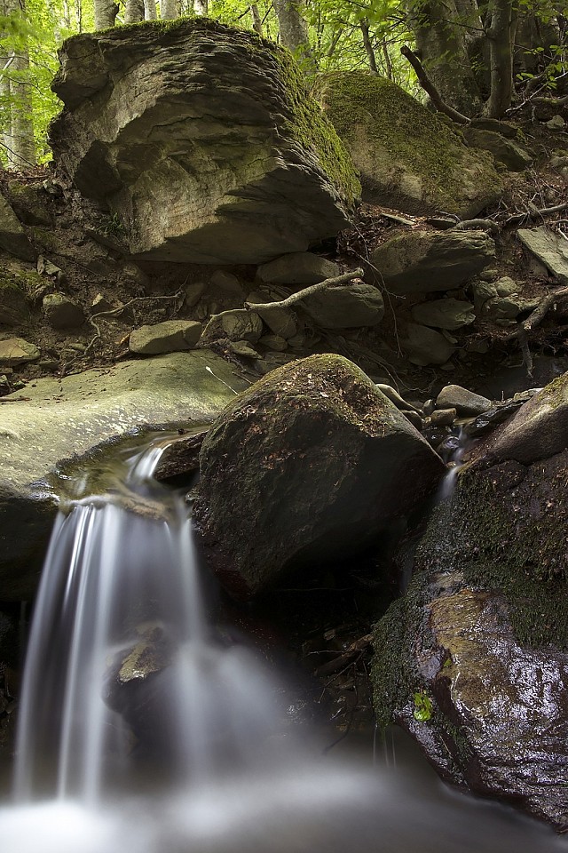 The Re della Pietra is a 2 km2 experimental forested catchment located in the Tuscan Apennines, Central Italy. The climate is temperate Mediterranean with wet (October–May) and dry (June–September) periods. The average annual precipitation depth is 1300 mm. Average monthly temperatures vary from 2 °C in January to 20 °C in August, and the average annual temperature is 10.5 °C. Elevations range from 634 to 1320 m a.s.l., the average slope is 27.5°, and the stream channel is approximately 3 km long. The catchment geology consists of sandstones corresponding to the Late Oligocene – Early Miocene Macigno Formation. The soil is well drained and typically deeper than 50–80 cm. Sand content ranged between 57 and 76 %, and clay content between 4 and 11 %. Soil texture is sandy loam, according to the USDA (1999) classification. The catchment area is predominantly covered by forests (>95 %), dominated by beech trees (Fagus sylvatica), oaks (Quercus cerris), and conifers (Pseudotsuga menziesii and Pinus nigra).